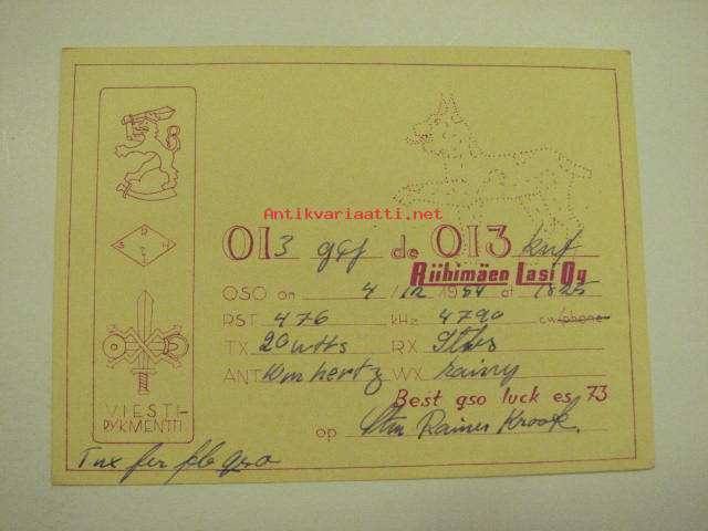 OI3DCZ / OI3KNF Viestirykmentti / Riihimäen Lasi Oy 4.12.1954, operator Rainer Krook -puolustusvoimain radiosähköttäjän yhteyskortti