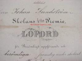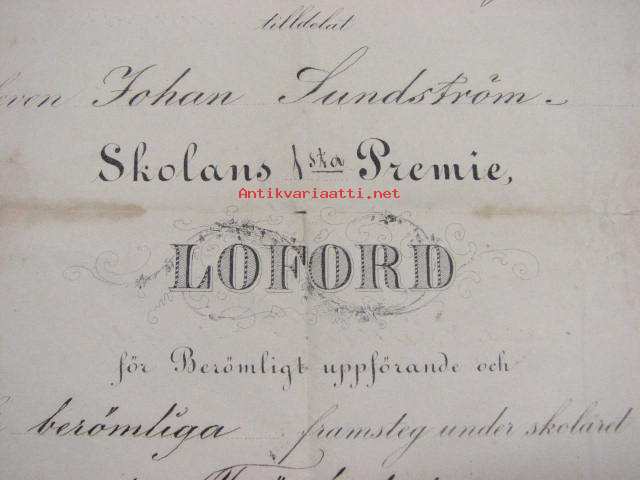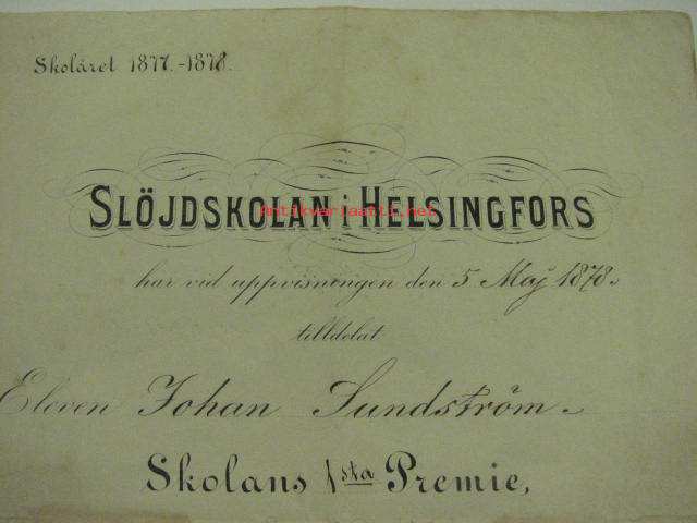 Slöjdskolan i Helsingfors, skolåret 1877-1878, har tilldelat eleven Johan Sundström Skolans 1sta Premie , LOFORD för berömligt uppförande... uti Träskulptur,