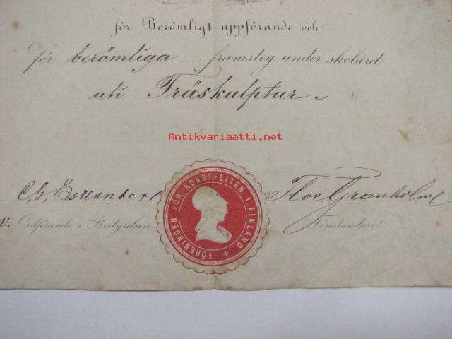 Slöjdskolan i Helsingfors, skolåret 1877-1878, har tilldelat eleven Johan Sundström Skolans 1sta Premie , LOFORD för berömligt uppförande... uti Träskulptur, allekirjoitukset C.G. Estlander, ?. Granholm -kunniakirja