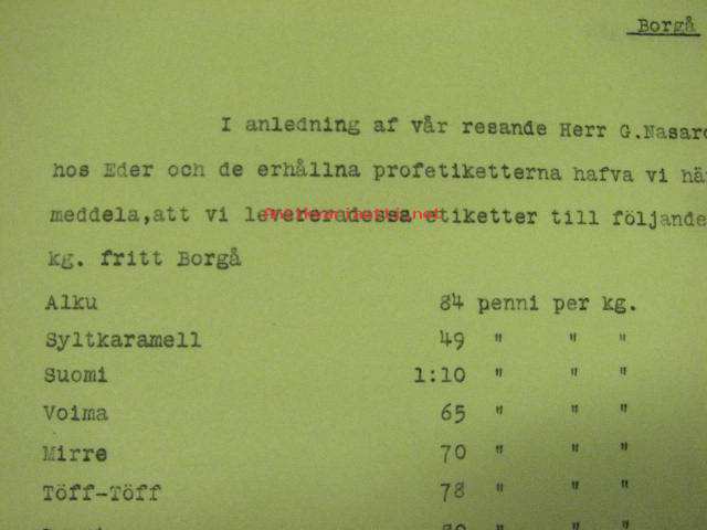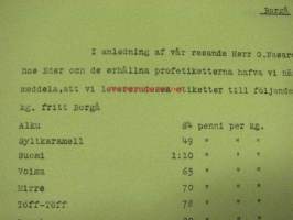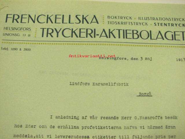 Frenckellska Tryckeri Ab, Helsingfors, Helsinki 3.5.1913 -asiakirja koskien karamellipapereita Lindfors Karamellfabrikille, Porvooseen