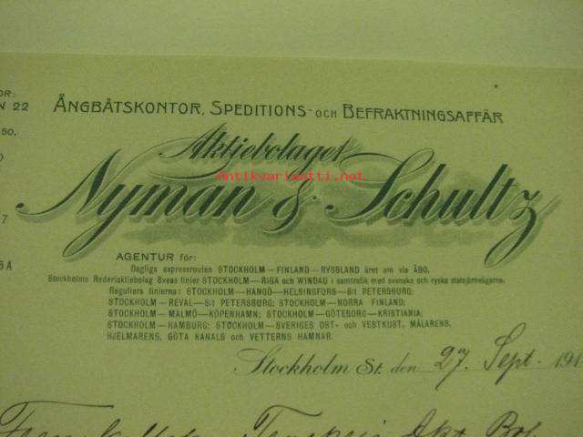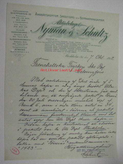 Ab Nyman & Schoultz Ångbåtskontor, Speditions- och Befraktningsaffär, Stockholm, 27.9.1912 -asiakirja