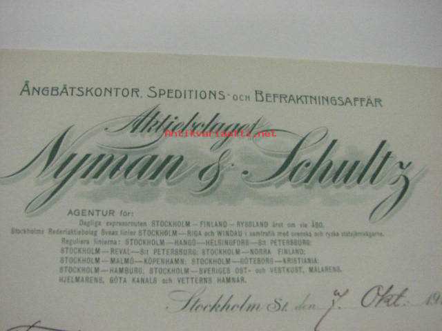 Ab Nyman & Schoultz Ångbåtskontor, Speditions- och Befraktningsaffär, Stockholm, 7.10.1912 -asiakirja