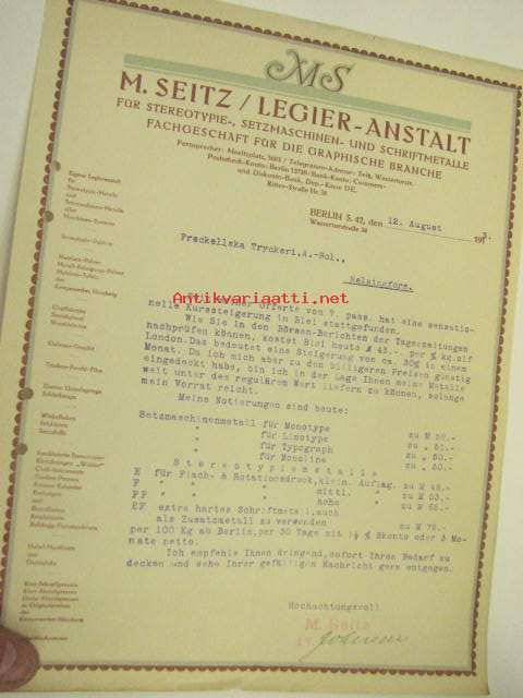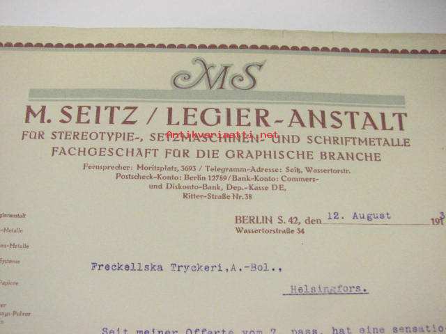 M. Seitz / Legier-Anstalt, Berlin, 12.8.1913 -asiakirja + Moderne Scliesszeuge-työkaluesite