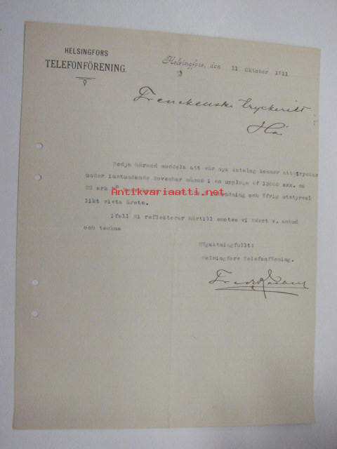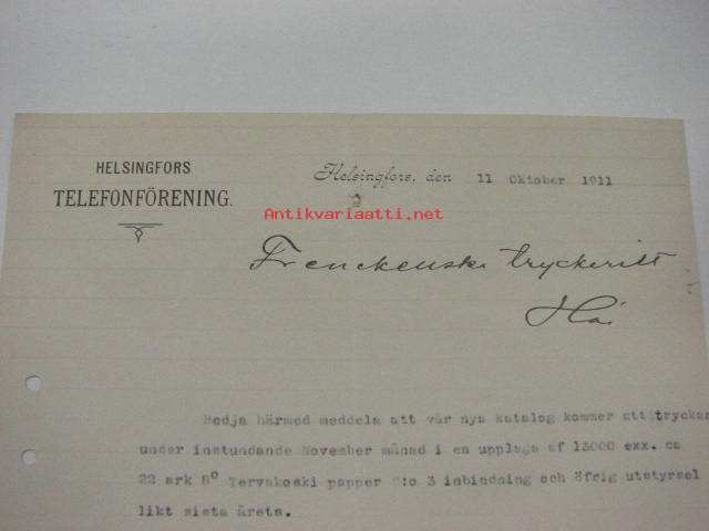 Helsingfors Telefonförening, Helsinki, 11.10.1911 -asiakirja