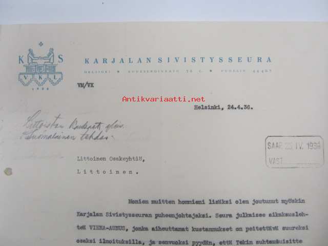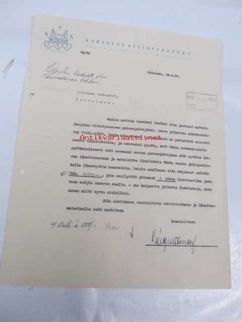 Karjalan Sivistysseura (Wienan Karjalaisten Liitto), 24.4.1936 asiakirja allekirjoitus Ville Mattinen