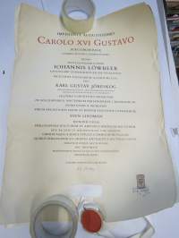 Upsalan yliopiston kunniatohtorin diplomi 1974 - Sven Lindman (Åbo akademi valtiopin professorille myönnetty), tekstissä myös maininta filosofian tohtorin arvosta ym