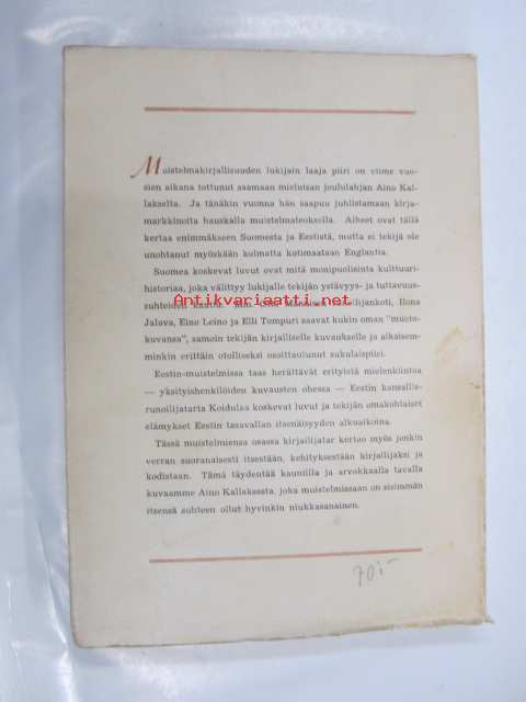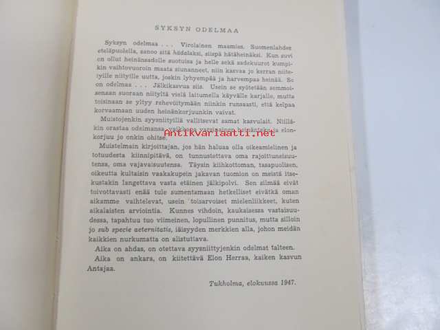 Saatavilla 1 kpl Julkaisuvuosi 1947 Sivuja 210 Painos 1 Kunto K2 Sidonta/painoasu Nidottu (pehmeäk.) Kielet Suomi