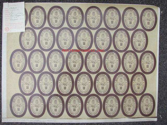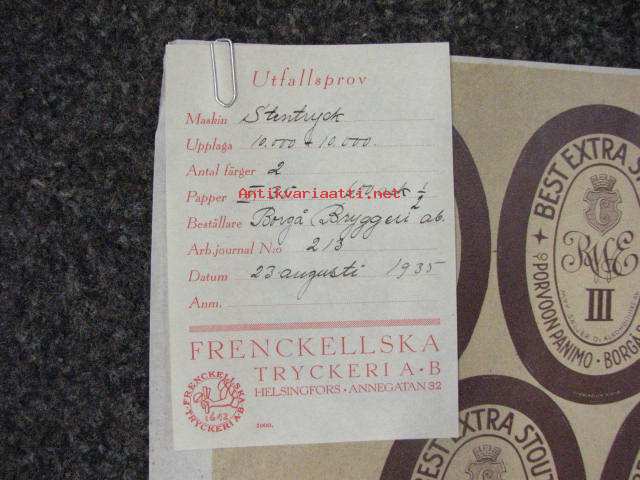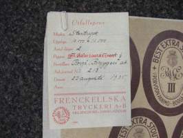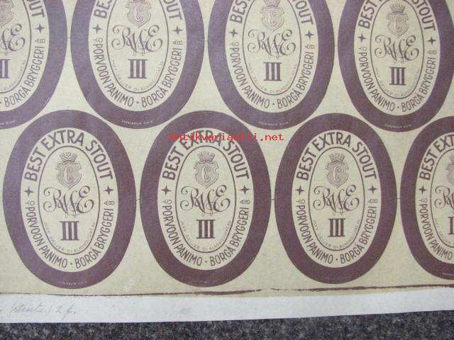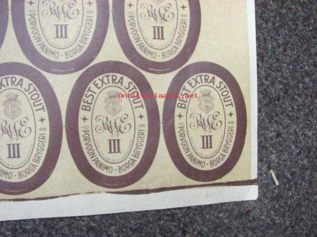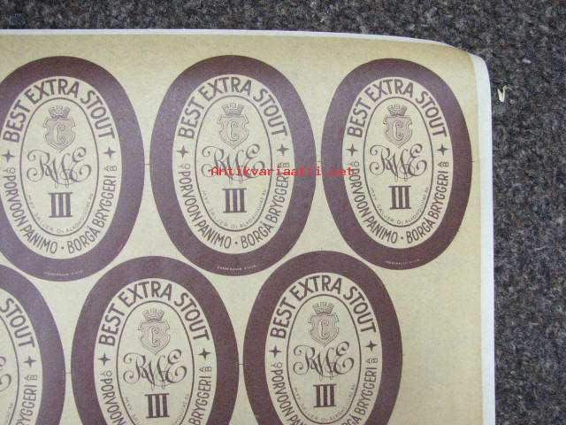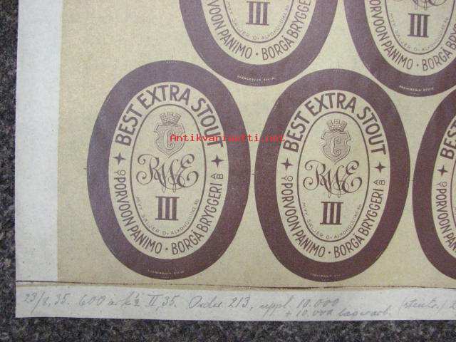 Porvoon Panimo - Borgå Bryggeri / Best Extra Stout -olutetikettiarkki v. 1935 -leikkaamaton, kirjapainon painatustietodokumentti mukana