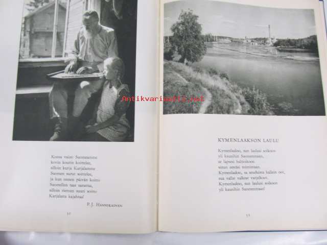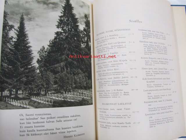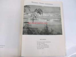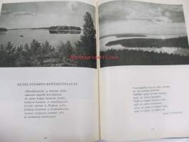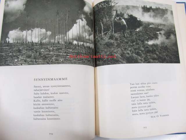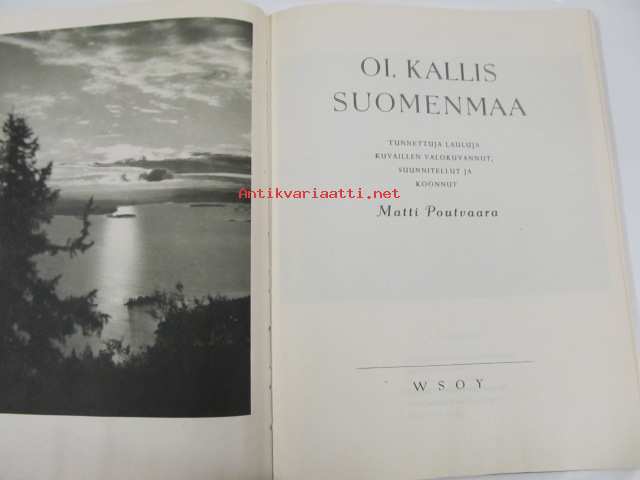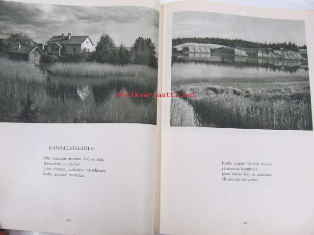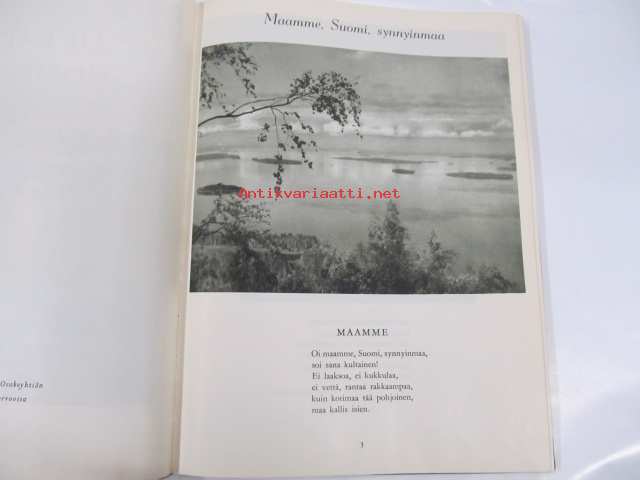Poutavaara Matti, WSOY, 1951 Oi, maamme, Suomi, synnyinmaa, soi sana kultainen! Mustavalkokuvitus, joka sivulla kuva ja runo