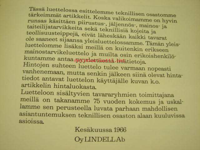 Lindell Teknillinen osasto yleisluettelo 1966