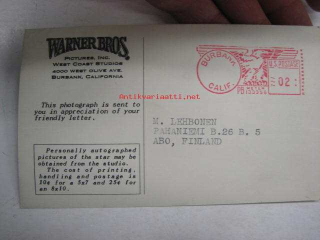 W. Morgan -filmitähden ihailijakortti, lähetetty Turkuun, painettu nimikirjoitus
