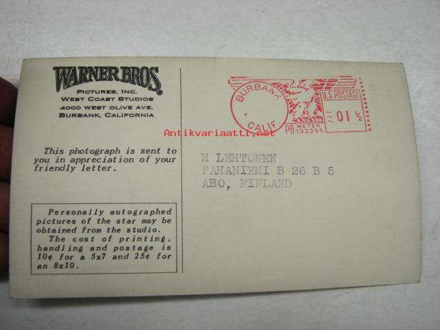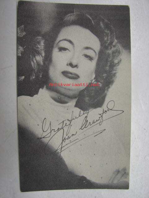 Joan Crawford -filmitähden ihailijakortti, lähetetty Turkuun, painettu nimikirjoitus