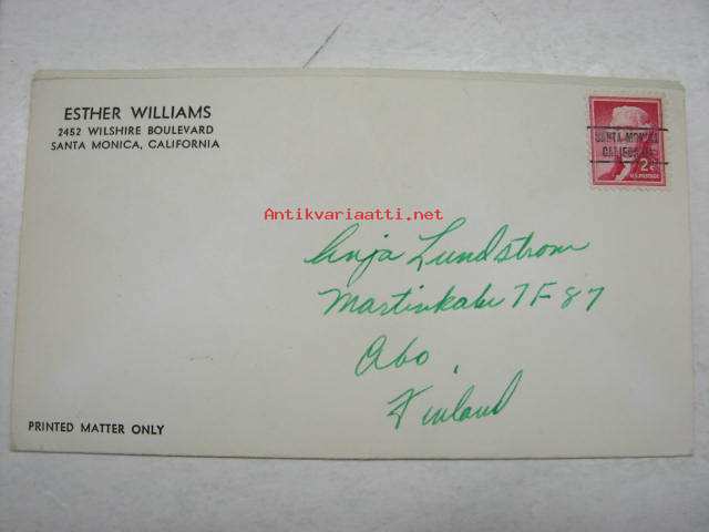 Esther Williams -filmitähden ihailijakortti, lähetetty Turkuun, painettu nimikirjoitus