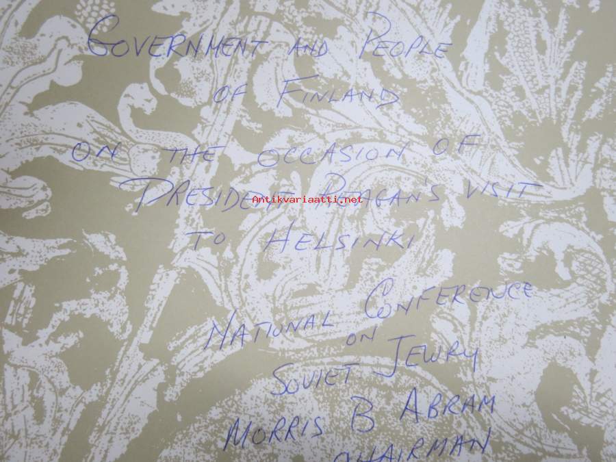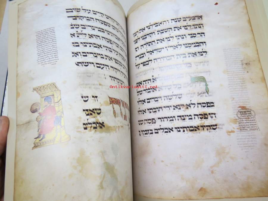 28 x 38 cm erillisessä kotelossa oleva vaikuttava kirja kuvineen (kyseessä siis näköispainos vanhojen juutalaisten tekstien 1400-luvun alkuperäisteoksesta) - kirjan saa varmasti hankittua maailmalta niin halutessaan, mutta tämä on poikkeuksellisella provenienssillä; Kirja on omistettu Suomen hallitukselle ja kansalle Yhdysvaltain presidentin Ronald Reaganin Suomenvierailun yhteydessä 1988 - tuolloinhan oli silloisen Neuvostoliiton juutalaisten maastamuutto tullut mahdolliseksi ja iso osa henkilöistä lennätettiin Finnairin lennoilla Amerikkaan. Tästä siis kiitollisena on kirja "National Conference of Soviet Jewry" puheenjohtajan Morris B. Abramin toimesta Suomen kansalle lahjoitettu - se on ottanut vastaan tuolloinen ylin valtiojohto.