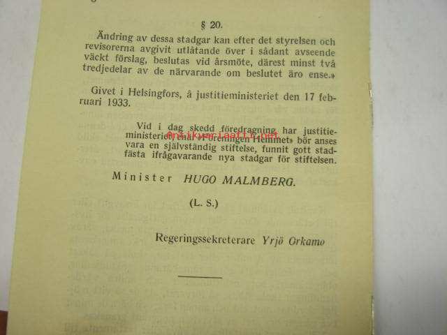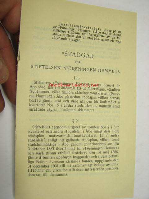 Stadgar för stiftelsen "Föreningen Hemmet" 1932 -säännöt vanhainkotiyhdistykselle