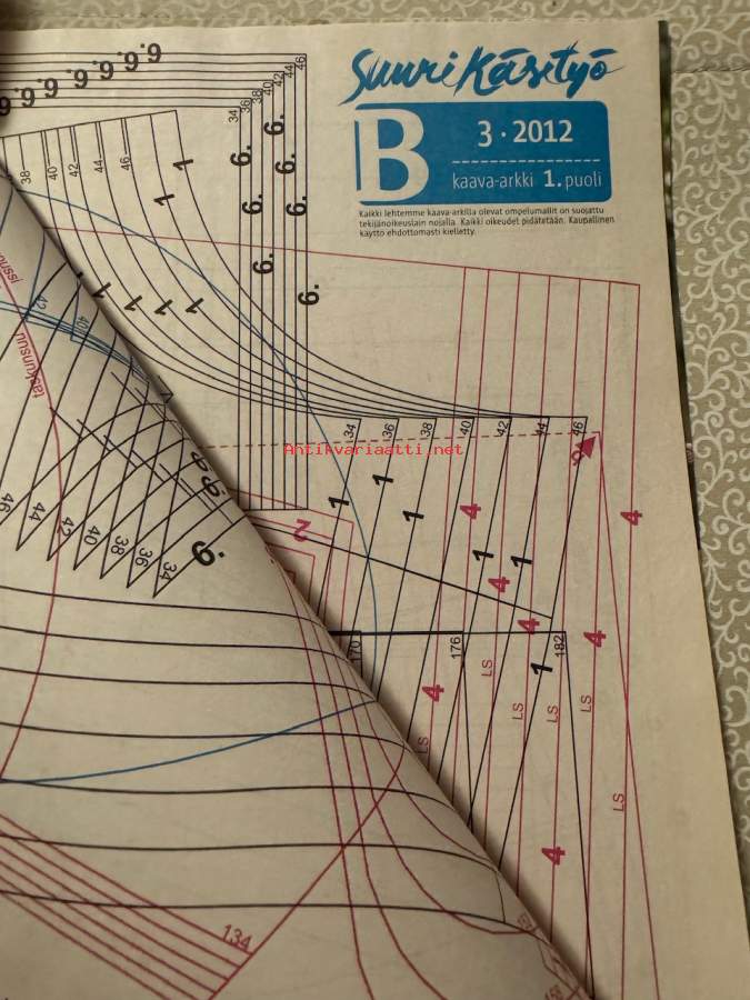 Suuri Käsityö 2012 nr 3, Paola Suhosen silkkimekko, Amy Butler mm. lattiatyyny, kaava-arkki