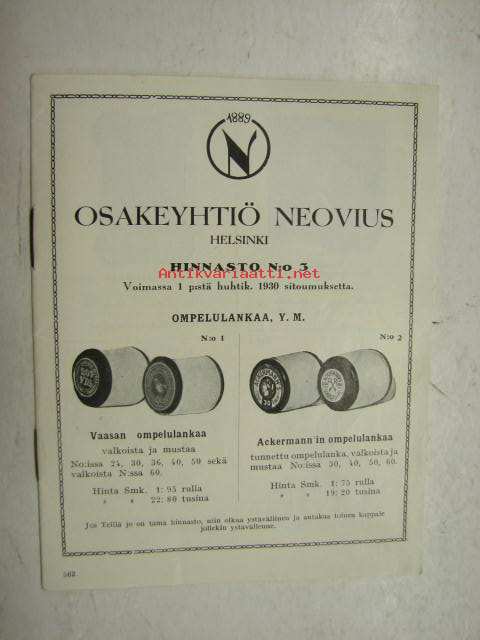 Osakeyhtiö Neovius - Ompelulankaa ym. Hinnasto nr 3 1930