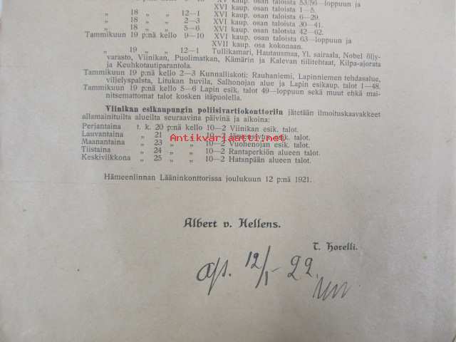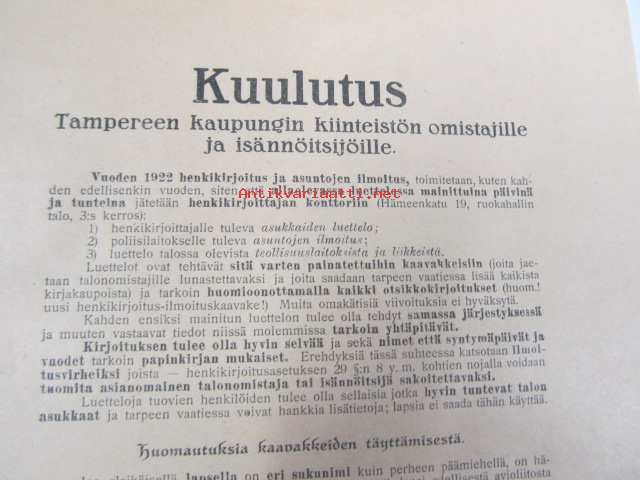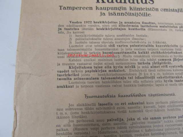 Kuulutus Tampereen kaupungin kiinteistön omistajille ja isännöitsijöille vuoden 1922 henkikirjoitus ja asuntojen ilmoitus