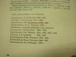 | Saatavilla | 1 kpl | | Julkaisuvuosi | 1950 | | Sivuja | 95 | | Painos | 1. | | Kunto | K2 | | Sidonta/painoasu | Nidottu (pehmeäk.) | | Kielet | Suomi |