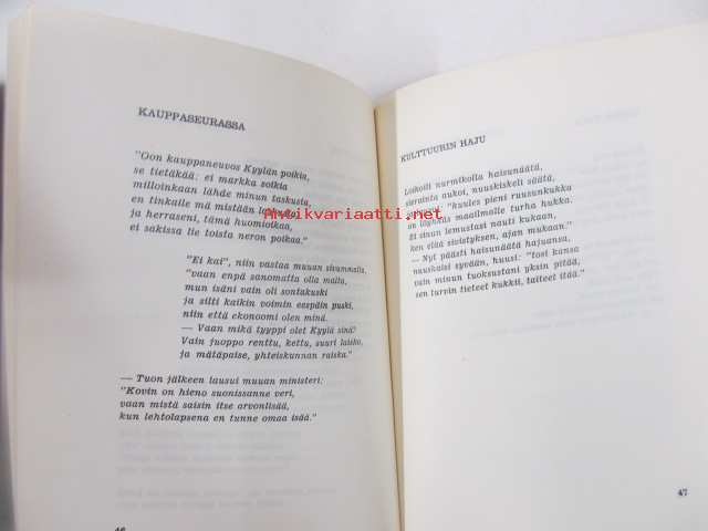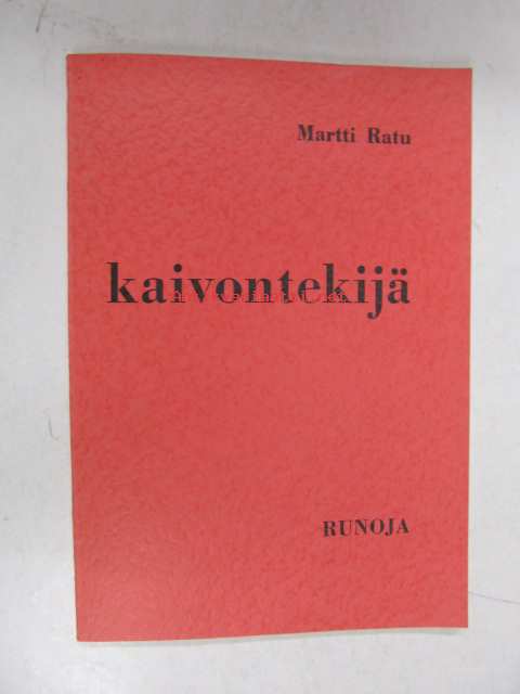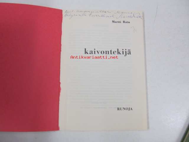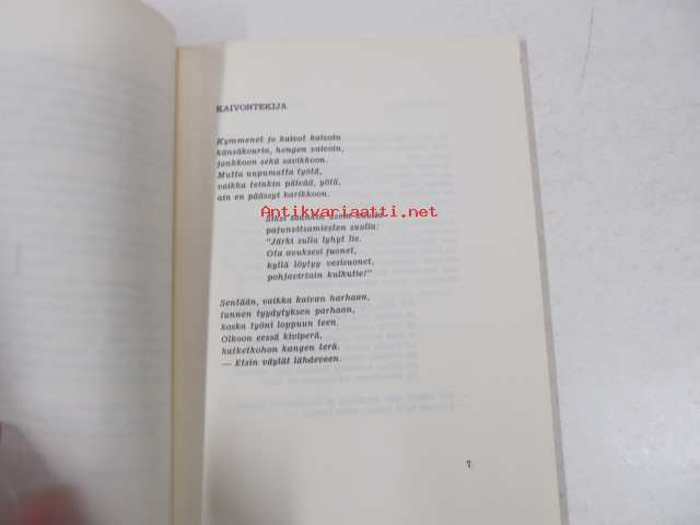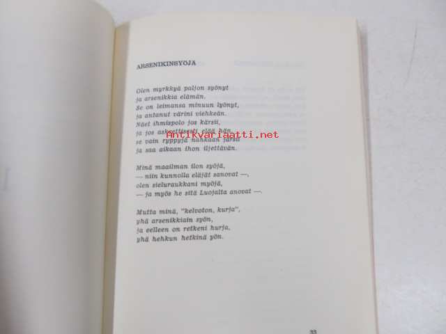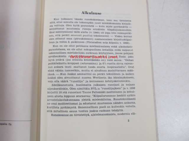 | Saatavilla | 1 kpl | | Julkaisuvuosi | 1972 | | Sivuja | 76 | | Painos | 1. | | Kunto | K3 | | Sidonta/painoasu | Nidottu (pehmeäk.) | | ISBN | 951-99002-2-5 | | Kielet | Suomi |