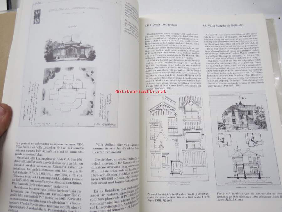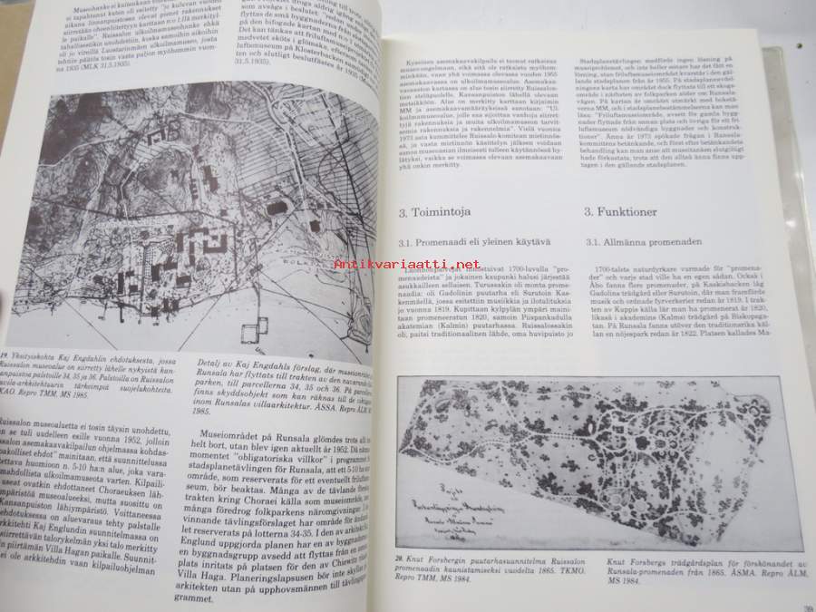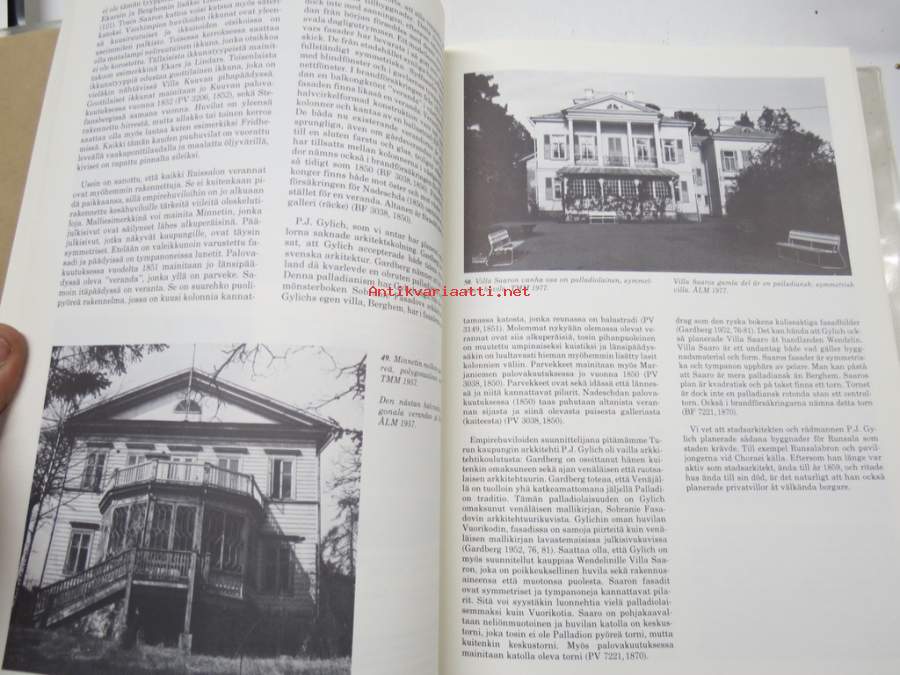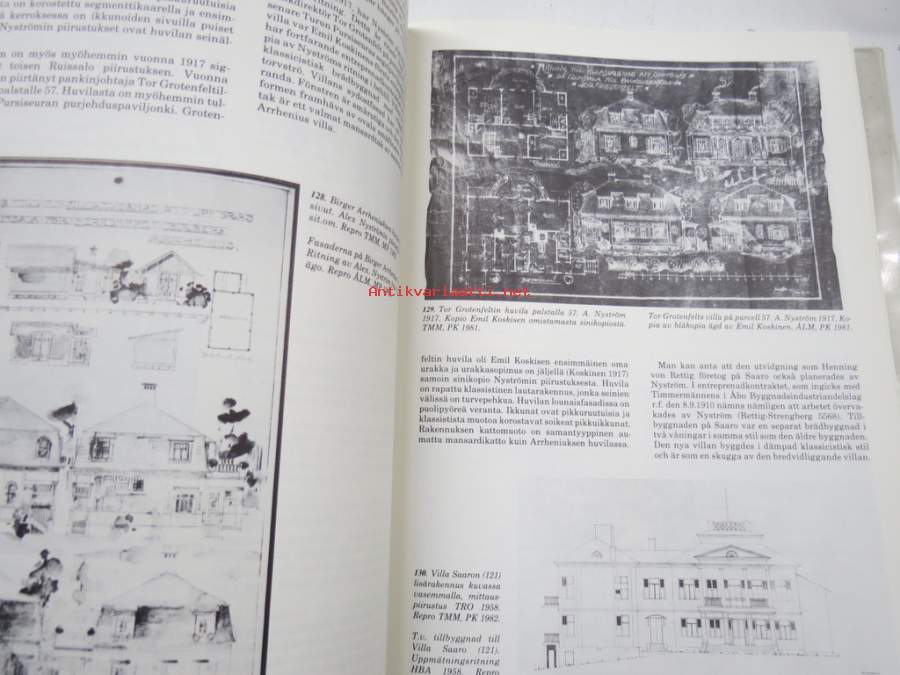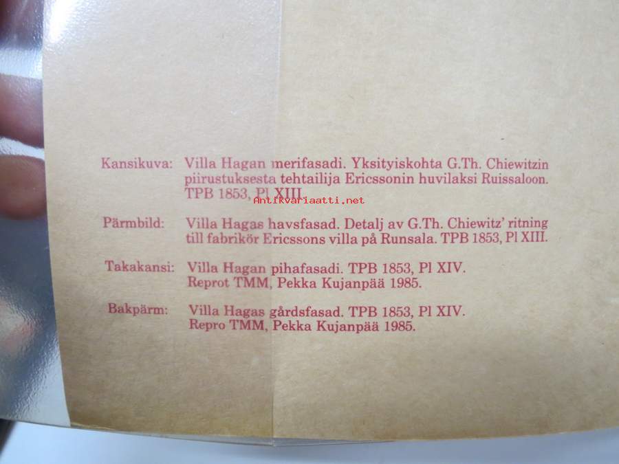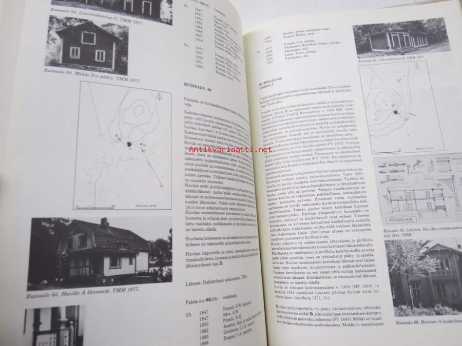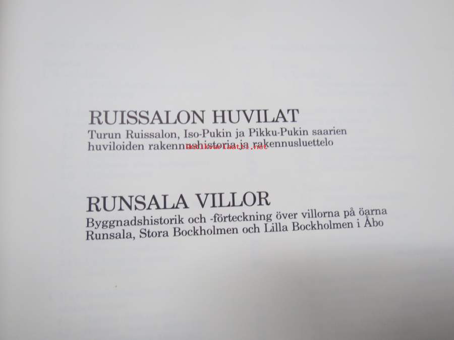 Helena Soiri-Snellman, Turun maakuntamuseo, 1985Ruissalon Huvilat - Turun Ruissalon, Iso-Pukin, ja Pikku-Pukin saarien huviloiden rakennushistoria ja rakennusluettelo / Runsala Villor - Byggnadshistorik och -förteckning över villorna på öarna Runsala, Stora Bockholmen och Lilla Bockholmen i Åbo, Turun maakuntamuseo raportteja nr 8 -the Villas of Ruissalo. 21 x 30 cm.