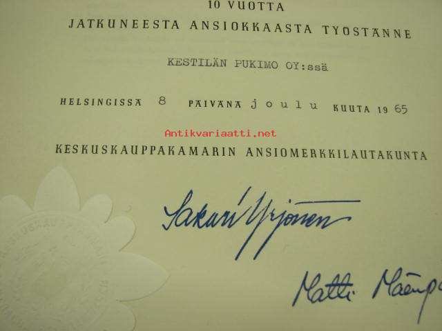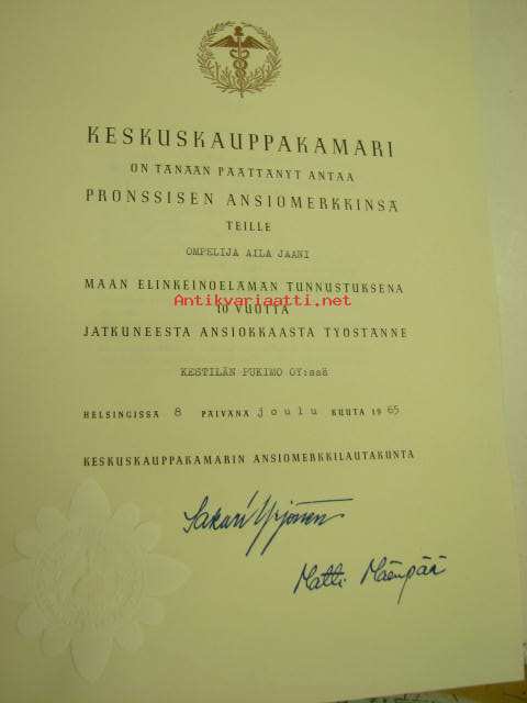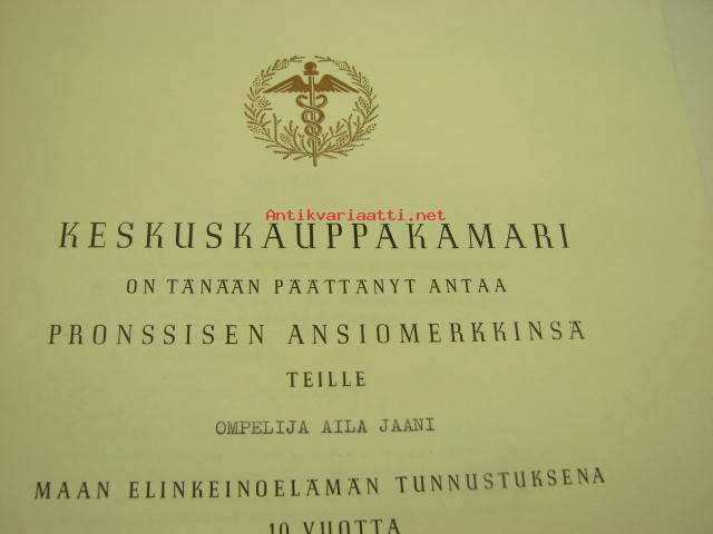 Keskuskauppakamari pronssinen ansiomerkki Aila Jaani -myöntökirja