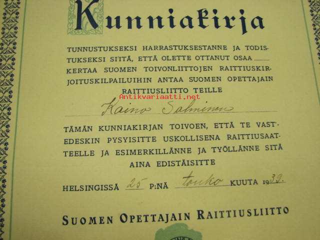 Suomen Opettajain Raittiusliitto, toivonliittojen raittiuskirjoituskilpailu, Kaino Salminen 1939 -kunniakirja