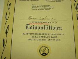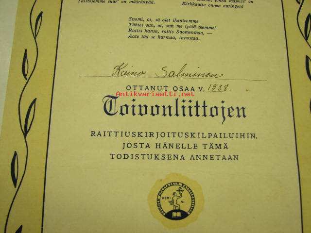 Suomen Opettajain Raittiusliitto, toivonliittojen raittiuskirjoituskilpailu, Kaino Salminen 1938 -osallistumistodistus