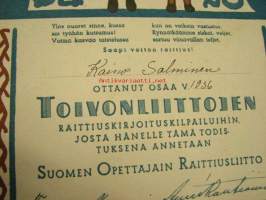 Suomen Opettajain Raittiusliitto, Toivonliittojen raittiuskirjoituskilpailu, Kaino Salminen 1936 -osallistumistodistus