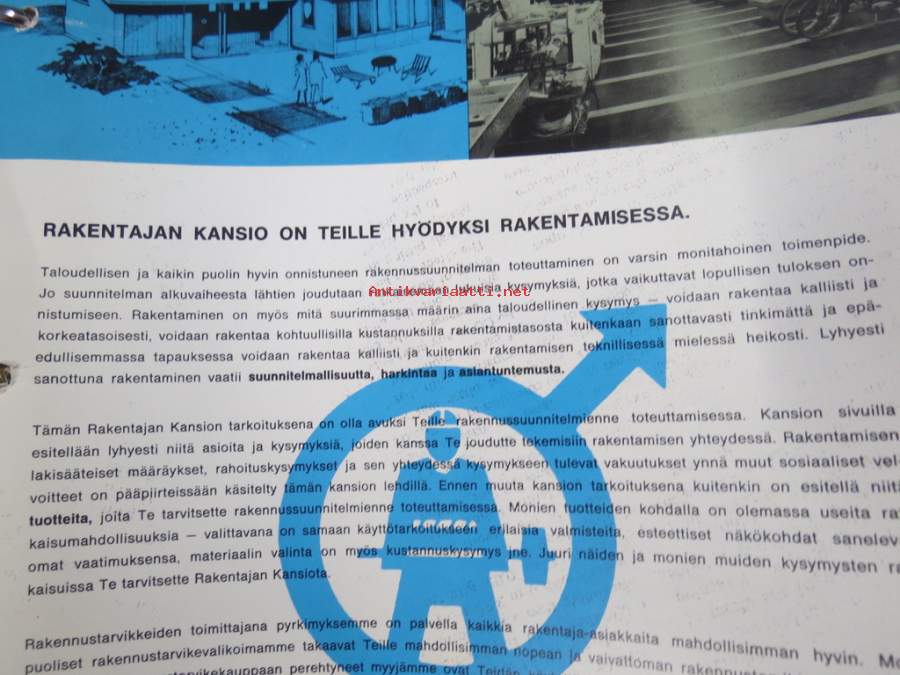 Rakentajan kansio vuodelta 1966, sisältää ohjeita ja määräyksiä, vihjeitä suunnitteluun ja toteutukseen, tuotemainoksia...
