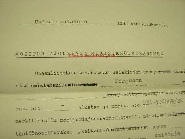Ferguson traktori -moottoriajoneuvon rekisteröimisanomus, asiakirja