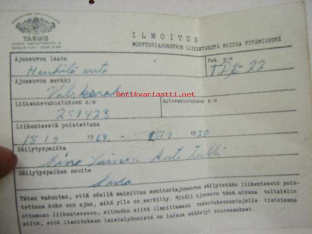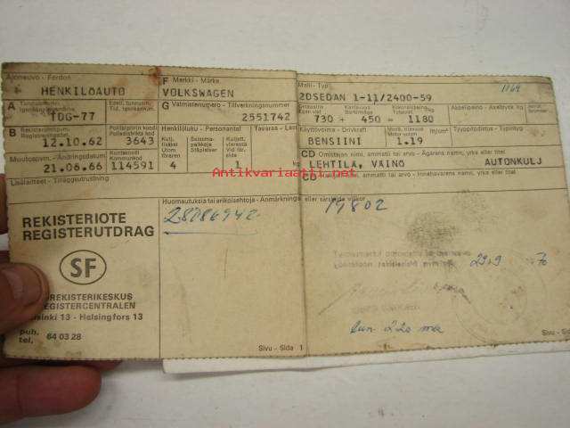 Volkswagen 2D Sedan 1-11/2400-59, rekisterinro TDG-77, Väinö Lehtilä -rekisteriote