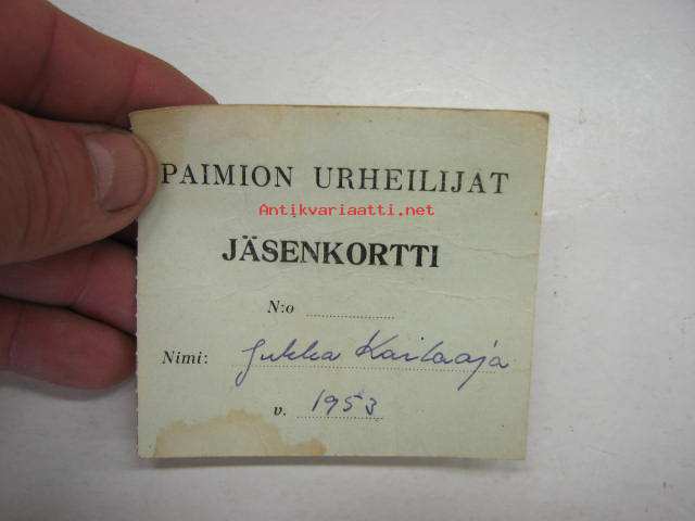 Paimion Urheilijat jäsenkortti Jukka Kailaoja v. 1953