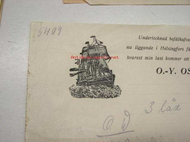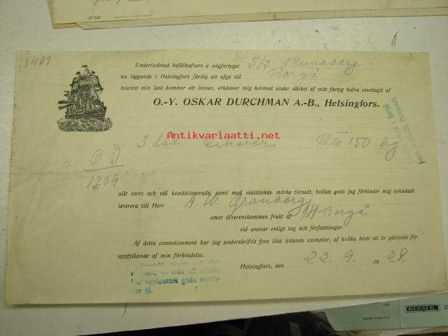 Höyrylaiva J.L. Runeberg / Oskar Durchman 22.9.1928 -konossomentti / laivarahtikirja "likörer"