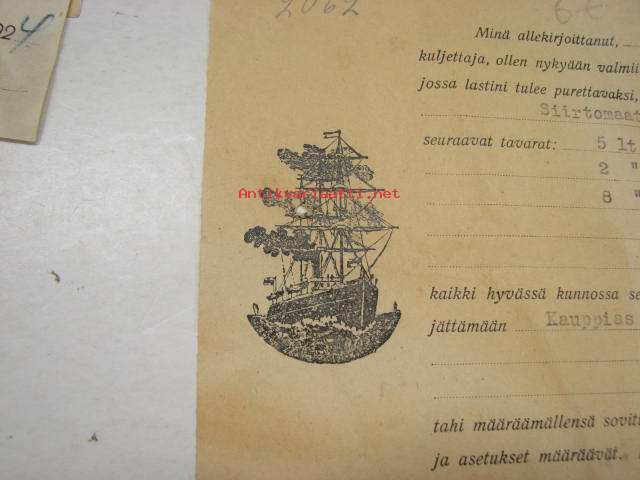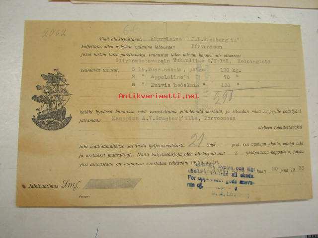 Höyrylaiva J.L. Runeberg / Siirtomaatavarain Tukkuliike Oy 20.6.1928 -konossomentti / laivarahtikirja "omenia, appelsiineja, kuivia hedelmiä"