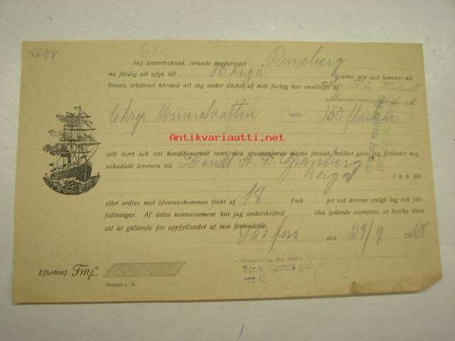 Höyrylaiva J.L. Runeberg / August Ludvig Hartwall 29.9.1928 -konossomentti / laivarahtikirja "mineralvatten"