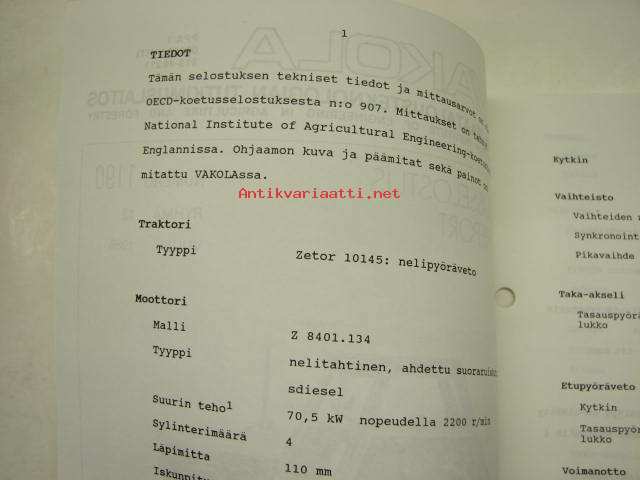 Zetor 10145 Vakola koetusselostus 1190 1986