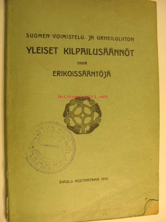 Kannessa mielenkiintoinen Suojeluskunnan Turun piirin leima. Tämän kirjan alkuperäinen omistaja oli suojeluskunnan urheiluohjaaja.
