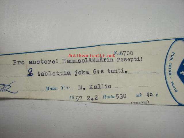 Puutorin Apteekki Turku, 2.2.1957 -apteekkisignatuuri