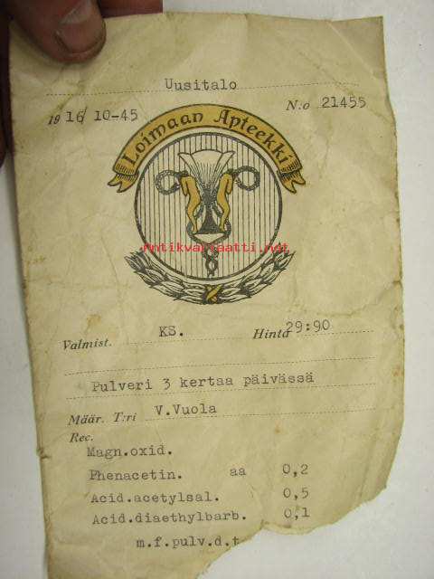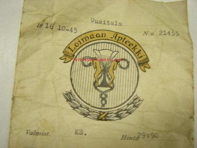 Loimaan Apteekki 16.10.1945 -apteekkisignatuuri / pussi