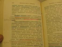 Sinipunakynällä ja lyijykynällä runsaasti alleviivauksia