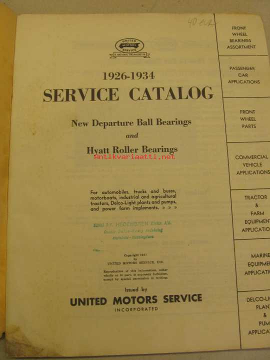 Englanninkielinen New Departure ja Hyatt -tuotemerkkien laakereiden luettelo. Ollut suomalaisen maahantuojan Hedengrenin käytössä. Jos ei mitenkään muuten kiinnosta, niin tässä on lueteltu mitä utopistisimpa automerkkejä, joista en ole pitkäaikaisena harrastajana kuullutkaan. Erittäin käyttökelpoinen inventoidessa mihin mainittujen merkkien vanhat varaosavarastot sopivat.