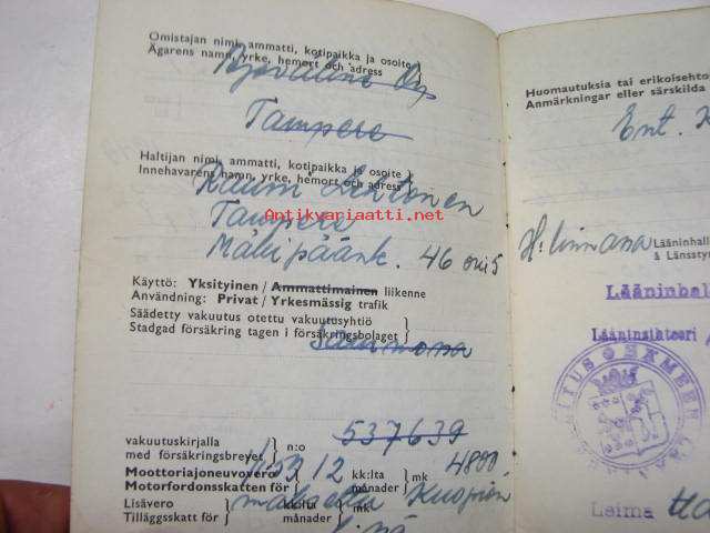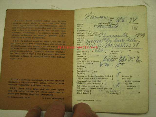 Plymouth 1949 Special De Luxe Sedan rek. no HÄ-34, haltija Rauni Lehtonen, Tampere -rekisteriote