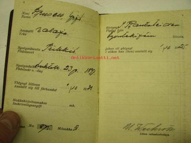 Suomen rautatieläisten liitto ry jäsenkirja Yrjö Krusell