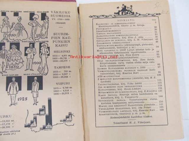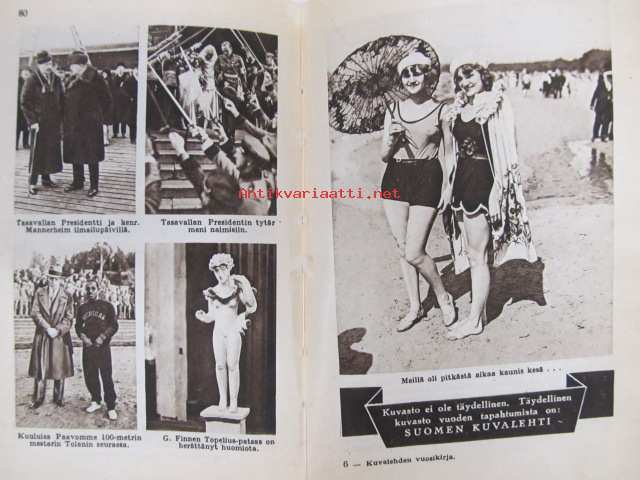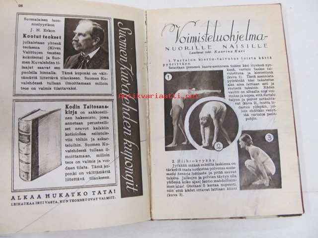 Suomen Kuvalehti, 1929 irtisaksittava kuvaleikki, Kuvalehden alennuskupongit, Voimisteluohjelma, Vilho Setälä Valokuvausopas, Kotiapteekki, Miten taideteoksia on katseltava, Voimistelusatu lapsille, ym. 12 x 17 cm.