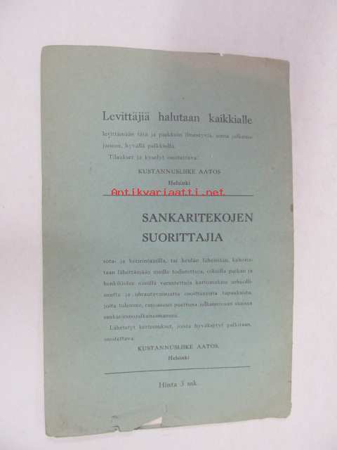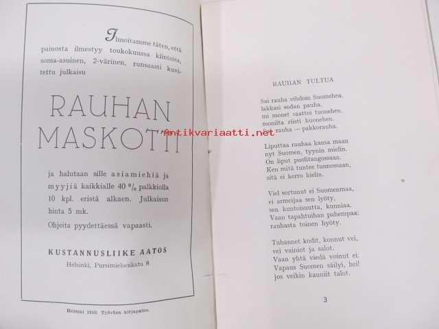 Saatavilla 1 kpl Julkaisuvuosi 1940 Sivuja 16 Painos 3. Kunto K2 Sidonta/painoasu Vihko Kielet Suomi