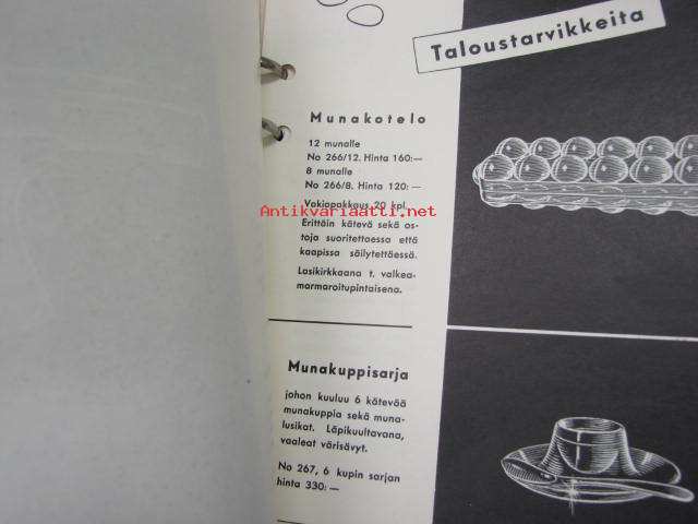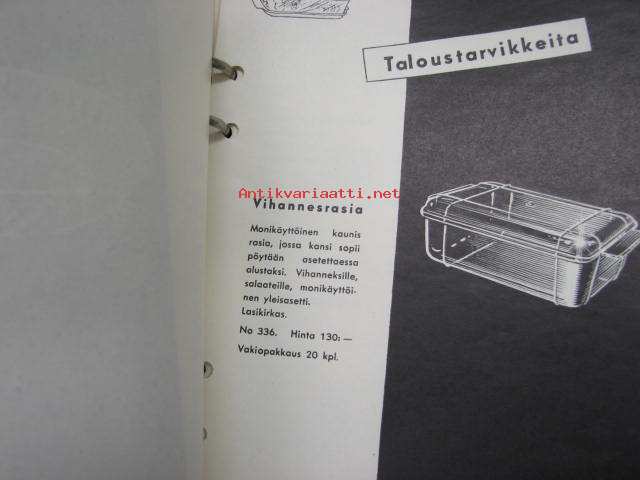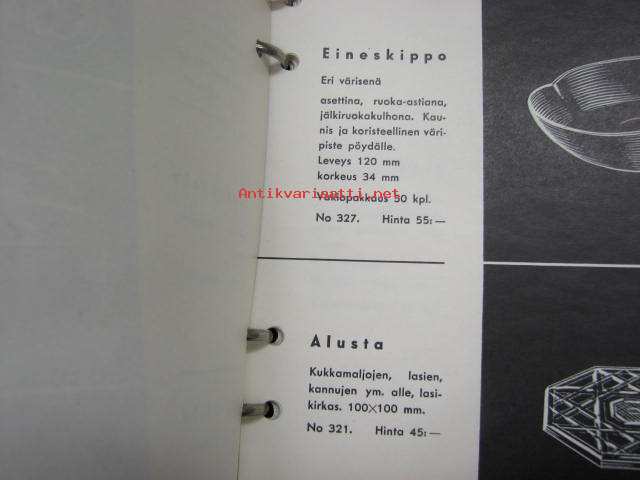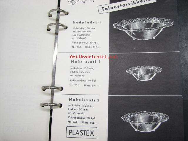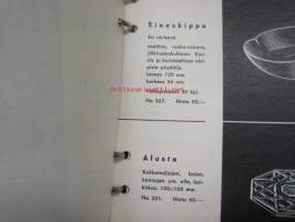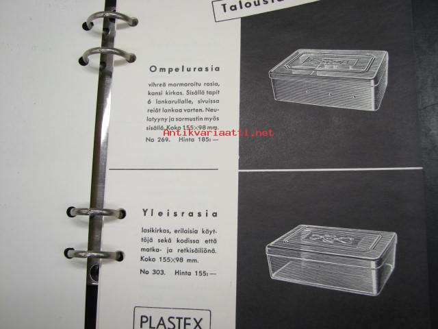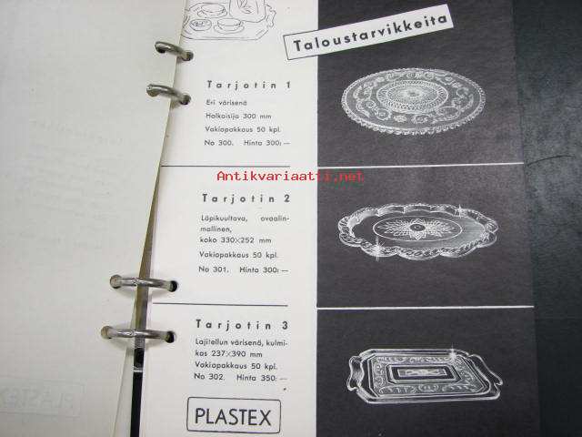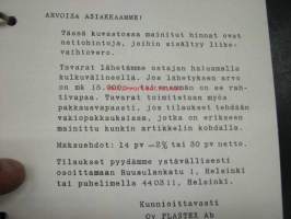 Oy Plastex Ab -tuoteluettelo 1950-luvulta, sisältää taloustarvikkeita, leikkikaluja