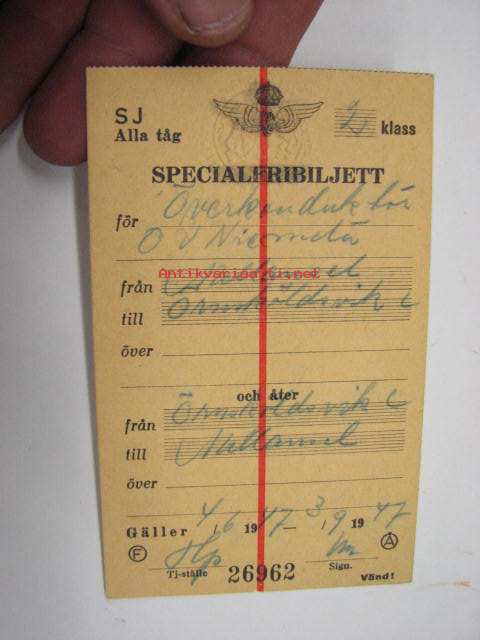 SJ (Statens Järnvägar) Alla tåg Specialfribiljett 2 klass Överkonduktör Niemelä Mellansel-Örnsköldsvik