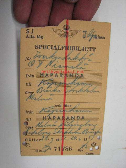 SJ (Statens Järnvägar) Alla tåg Specialfribiljett 3 klass Överkonduktör Niemelä Köpenhamn-Haparanda