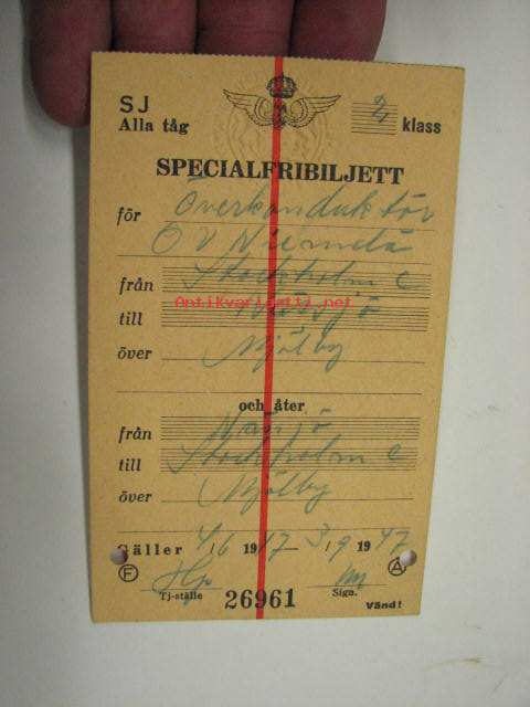 SJ (Statens Järnvägar) Alla tåg Specialfribiljett 2 klass Överkonduktör Niemelä Nässjö-Mjölby